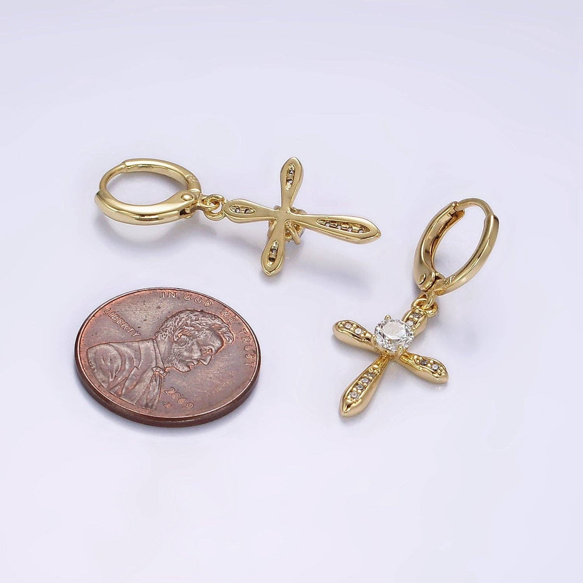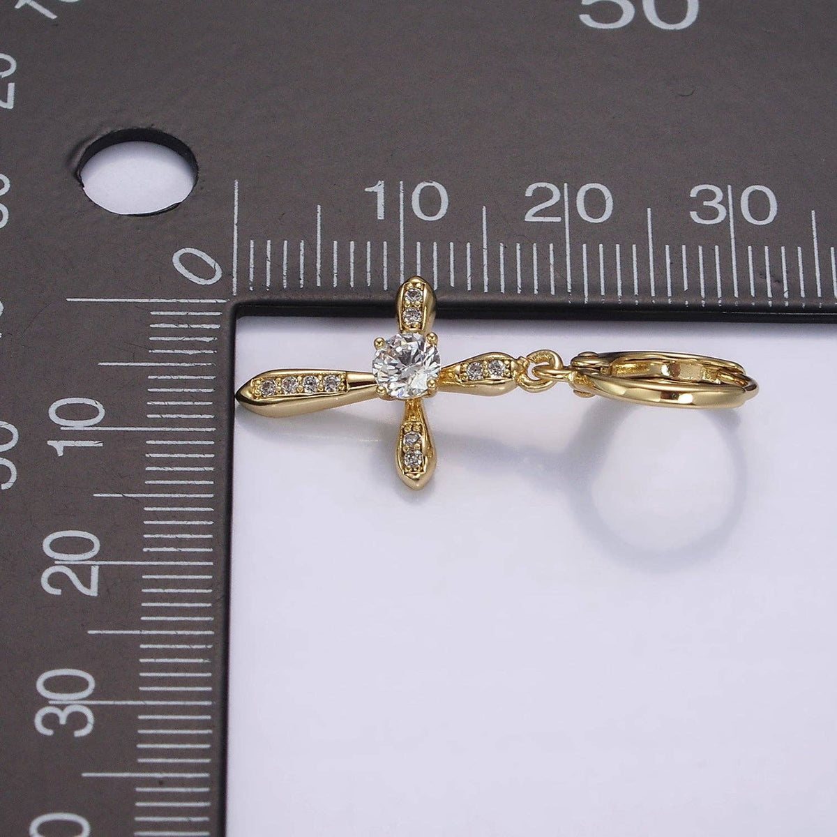 14K Gold Filled Micro Paved CZ Religious Cross Drop Huggie Earrings | AE935