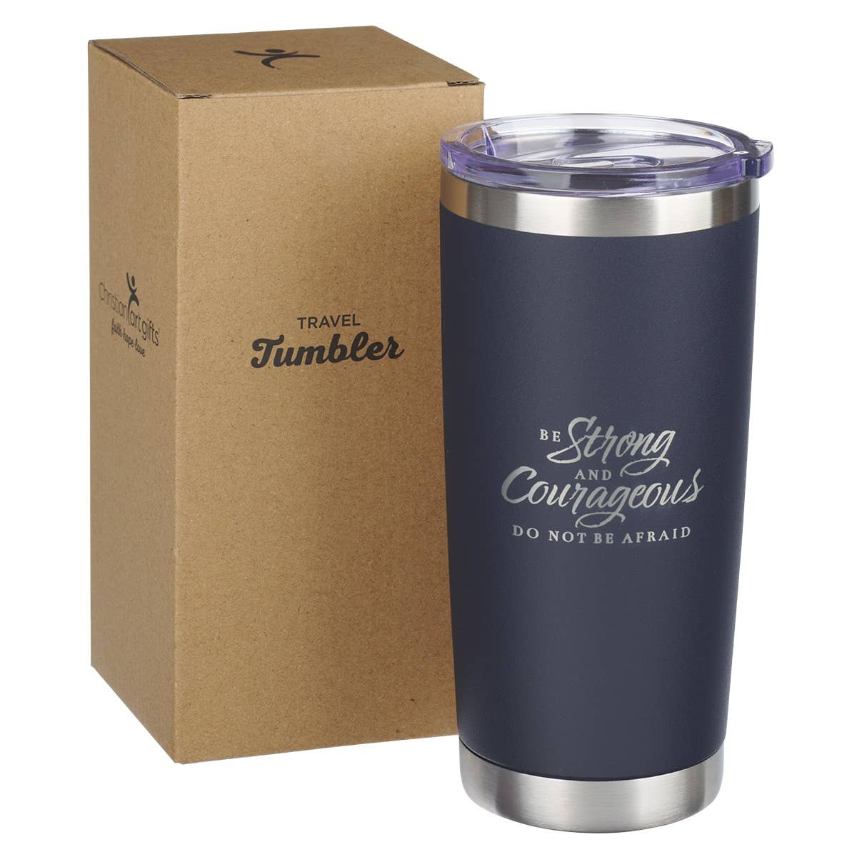 The understated elegance of the Be Strong and Courageous Navy Stainless Steel Travel Tumbler makes it an ideal choice to thank a pastor for his commitment and hard work. The thoughtful gift is a meaningful way to honor his steadfast dedication to caring for the flock.   Navy background with silver stainless steel text, Stainless steel travel tumbler, Laser engraved text, Be strong and courageous, Joshua 1:9, Strong and Courageous Butterscotch and Navy Collection, Clear plastic lid, Retractable sip-hole cover, Double-wall insulated, Stainless steel interior, Hot or cold beverages, Matte finish, Not dishwasher, microwave, or freezer-safe, Handwash recommended, Packaged in a tuck-top Kraft cardboard box, Capacity: 18 fl. oz. (532ml), Mug dimensions: 7.4" x 3.6" x 3.5" (188 x 91 x 89 mm), Packaging dimensions: 7.7" x 3.6" x 3.6" (196 x 94 x 94 mm)