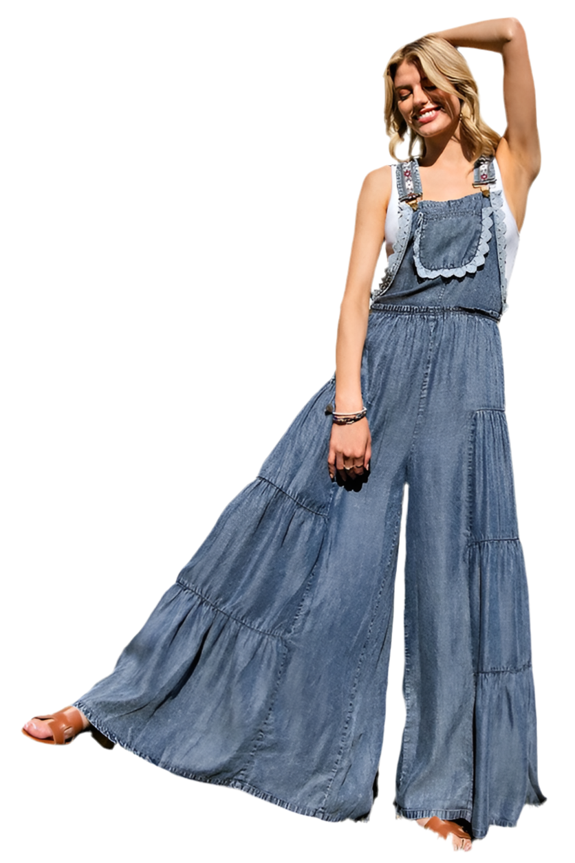 Lace Trim Tiered Sleeveless Denim Jumpsuit