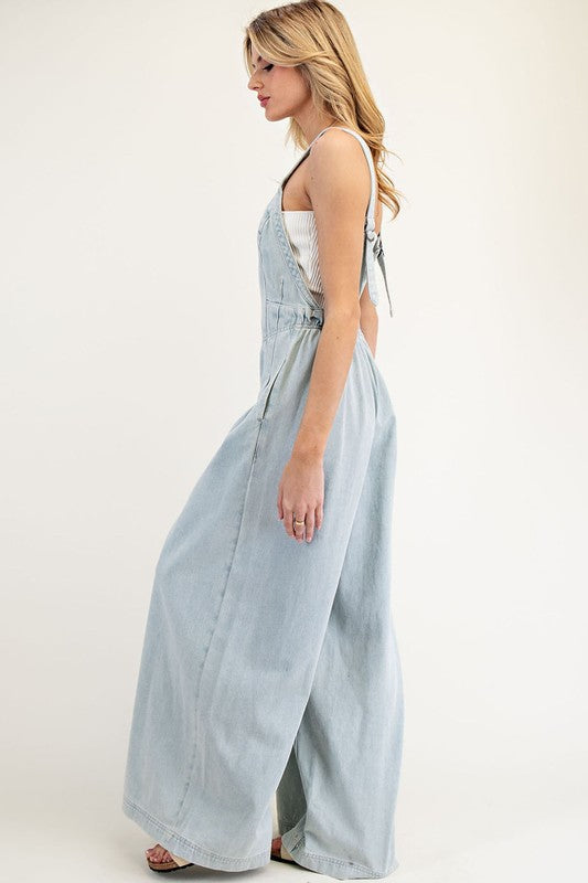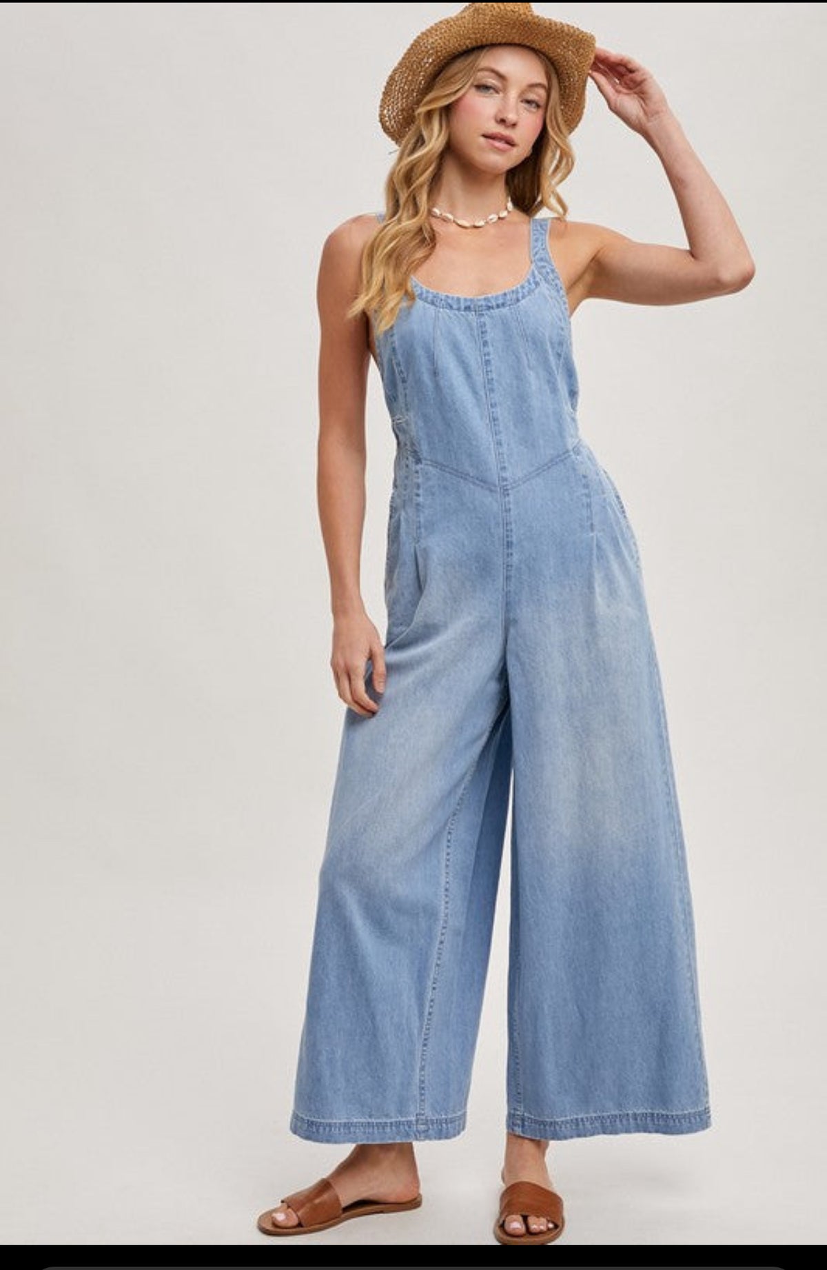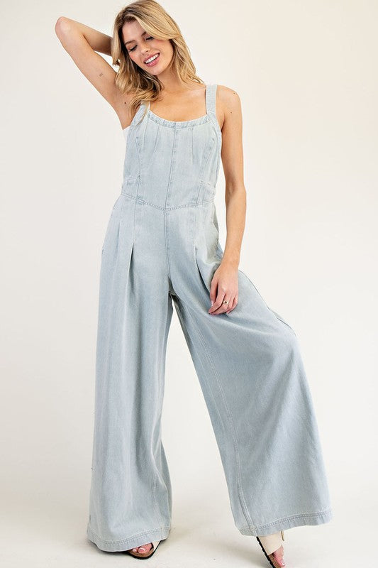 Mineral washed sleeveless jumpsuit featuring a scoop neckline,