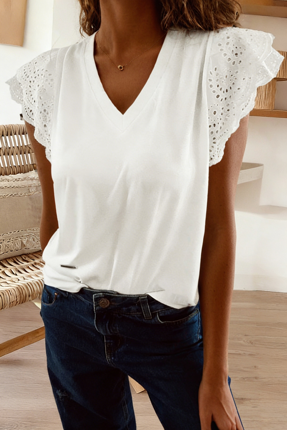 🎀Material: 95%Cotton+5%Elastane 😍Why You’ll Love It? Eyelet embroidery adds a delicate and textured detail to this tee. Flutter sleeves create a feminine and playful touch. Patchwork design adds a trendy and stylish look. V neck offers a flattering and versatile neckline, perfect for casual or everyday wear.