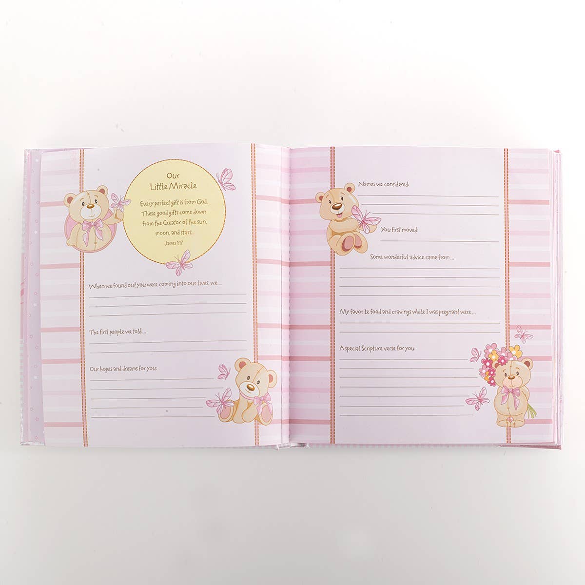 This sweet pink gingham baby book for girls is 64 pages of keepsake records of a baby's birth and first year. There are prompted pages to fill in, scrapbooking pages for photos and more, small envelopes for the hospital bracelet and a lock of hair from the first haircut, and 2 full pockets for assorted keepsakes. The pages carry quotes, poems, prayers and verse from Scripture - all conveying the beauty and design of bringing forth this new life.