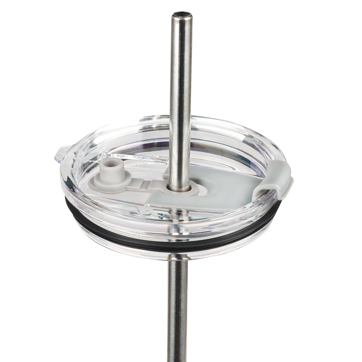 Pink and peach-colored rose design, White powder-coated mug, Pink-foiled text, Be still and know that I am God, Psalm 46:10, Matte finish, Stainless steel travel mug, Reusable stainless steel straw, Silicone gasket on lid, Clear plastic lid, Pop-up sip hole cover, Double-wall insulated stainless steel interior, Hot or cold beverages, Maintains temperature, Matte finish, Not dishwasher, microwave, or freezer-safe, Hand-wash recommended, Packaged in a tuck-top Kraft cardboard box, Capacity: 18 fl. oz. (532ml), Mug dimensions: 7" x 3.8" x 3.5" (178 x 97 x 89mm), Packaging dimensions: 9.1" x 3.8" x 3.7" (231 x 97 x 94mm)