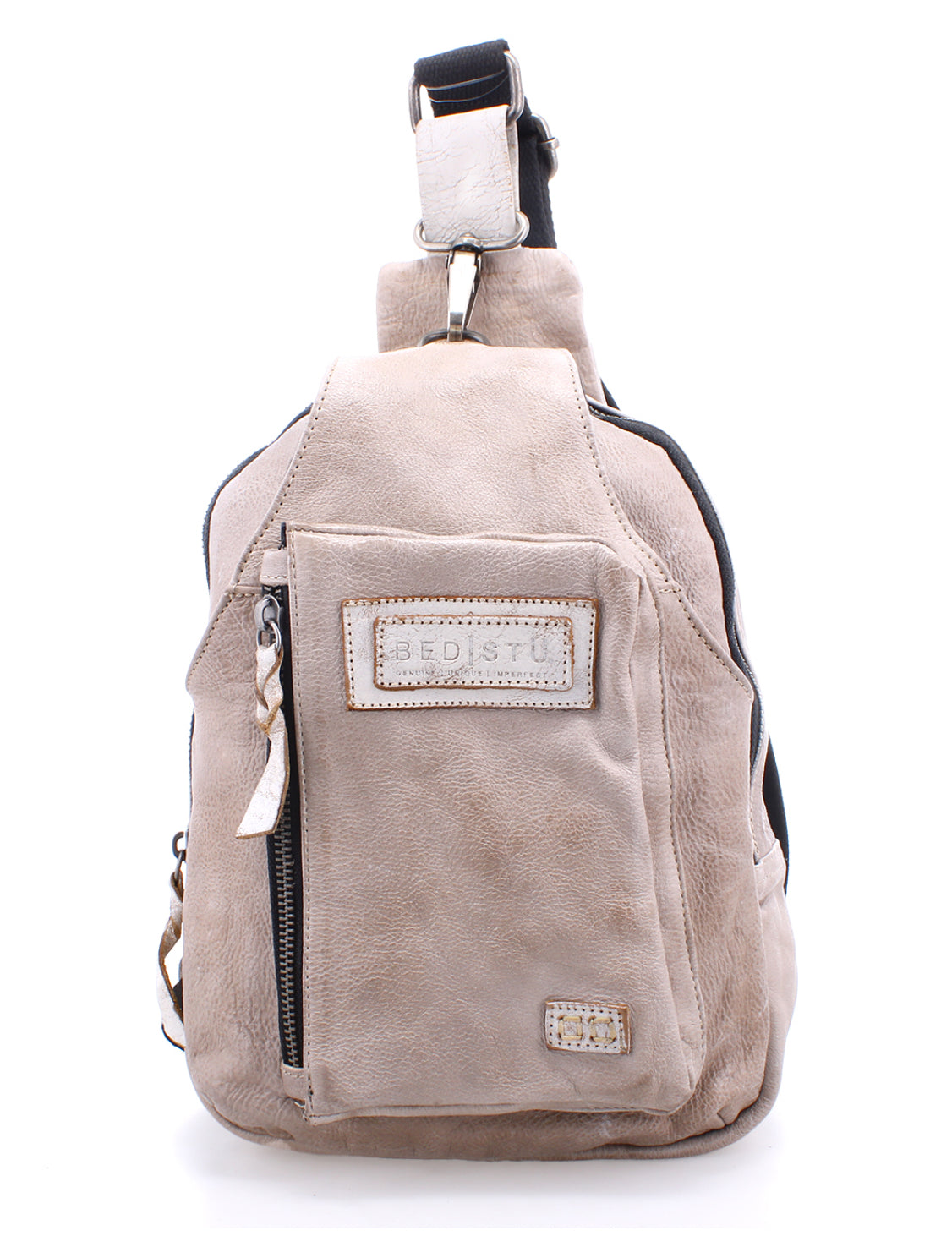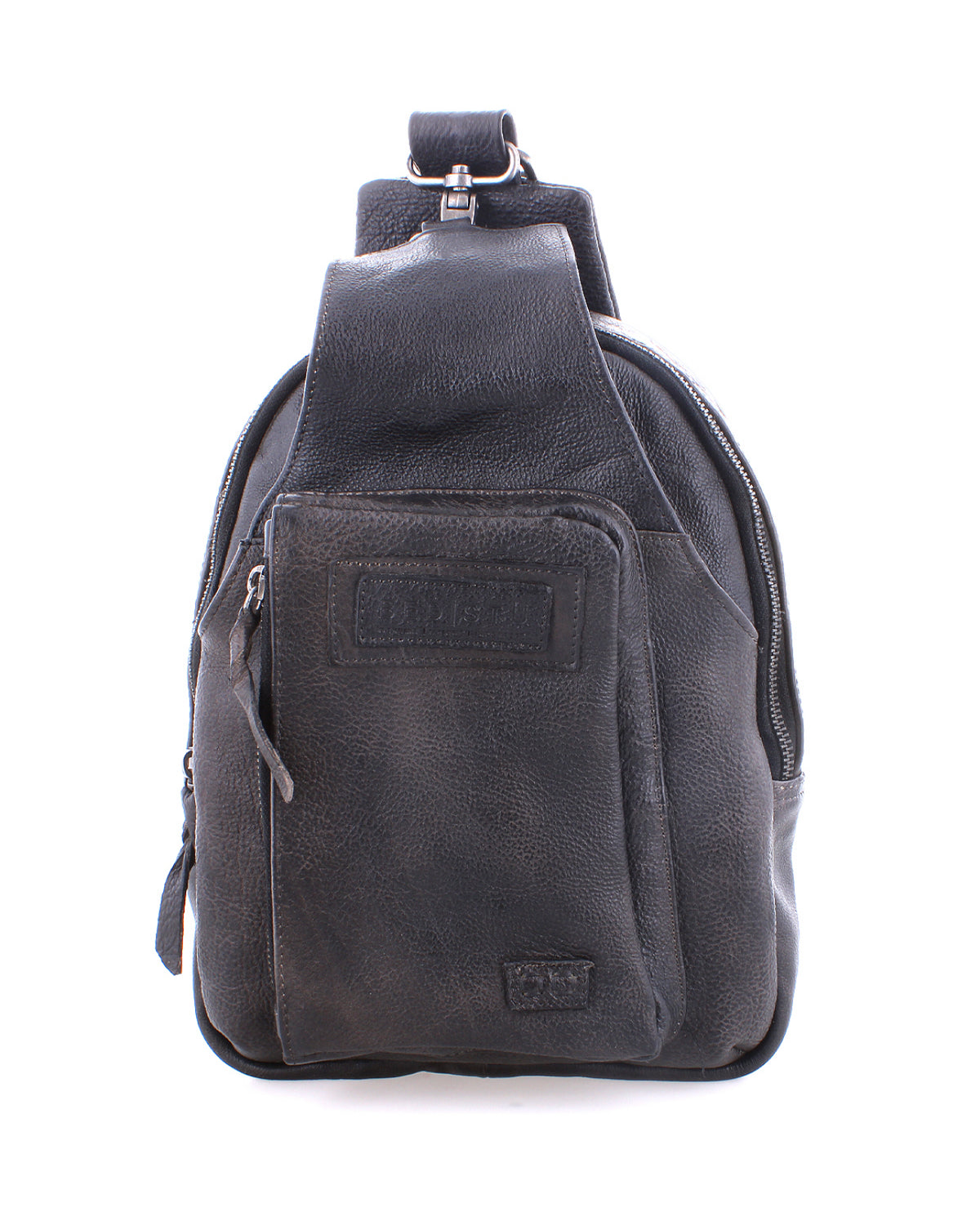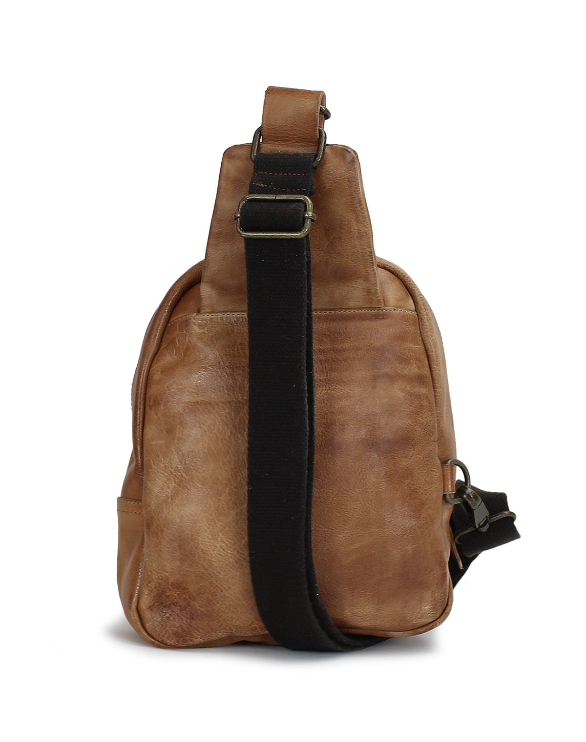 • One arm, sling leather backpack with adjustable fabric strap