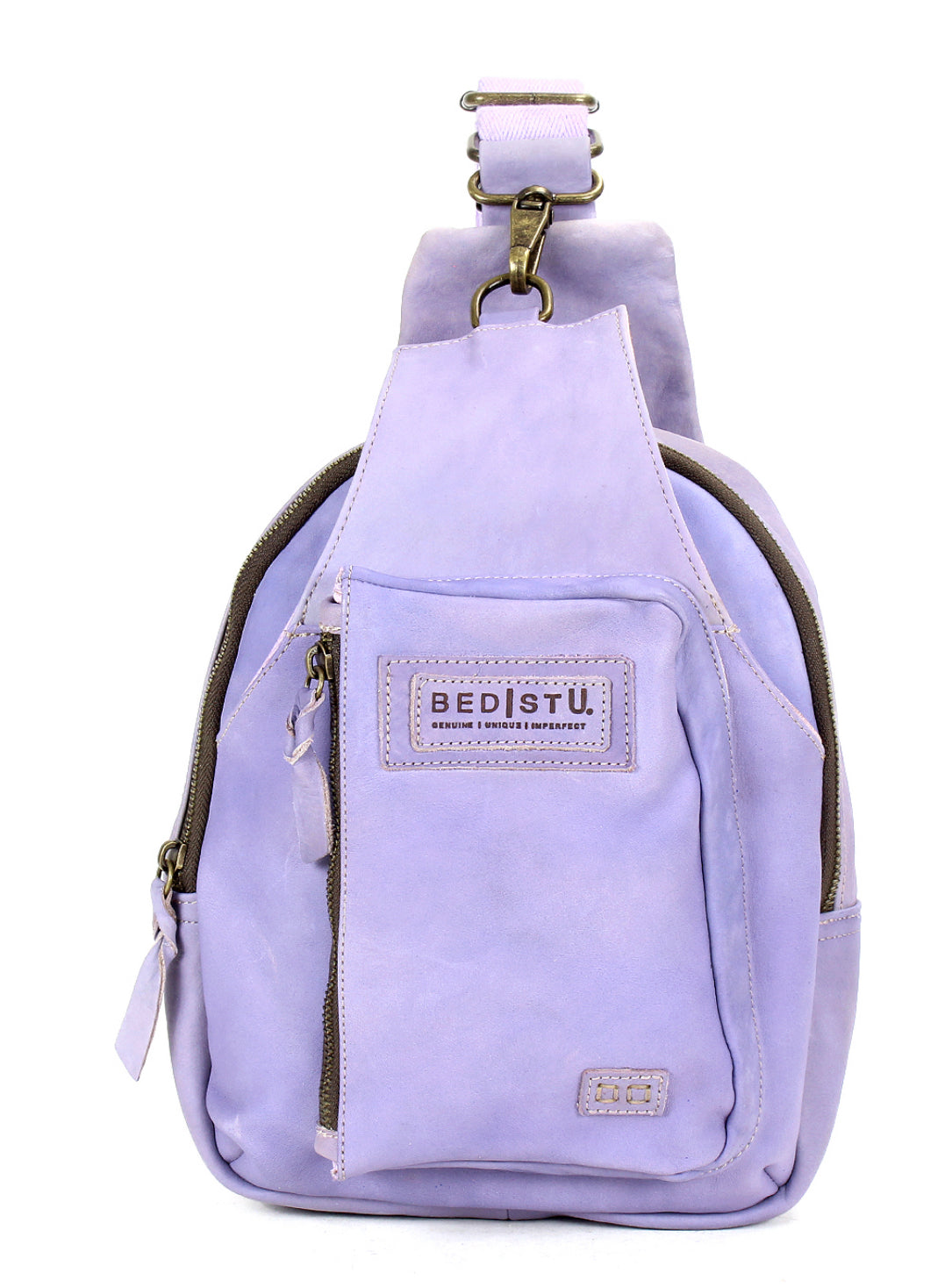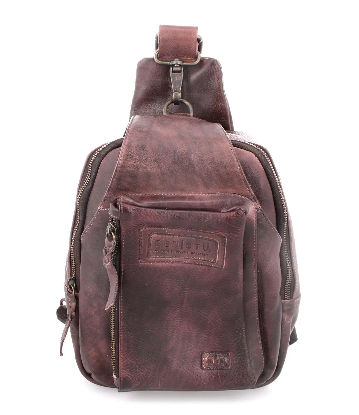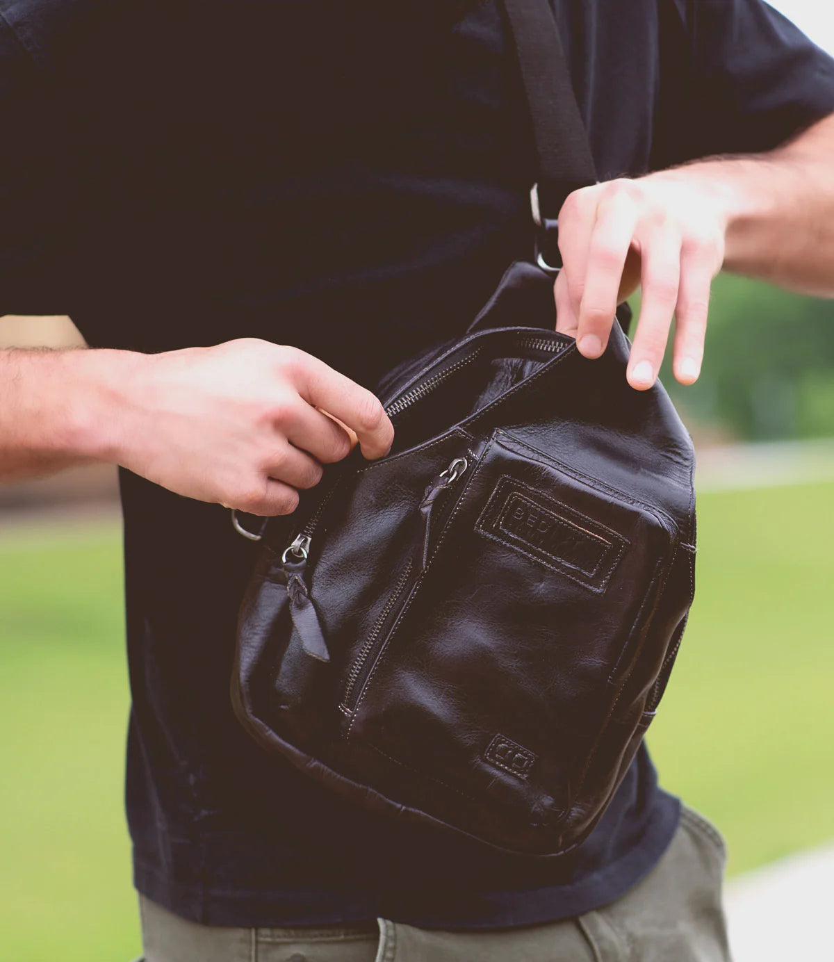 • One arm, sling leather backpack with adjustable fabric strap