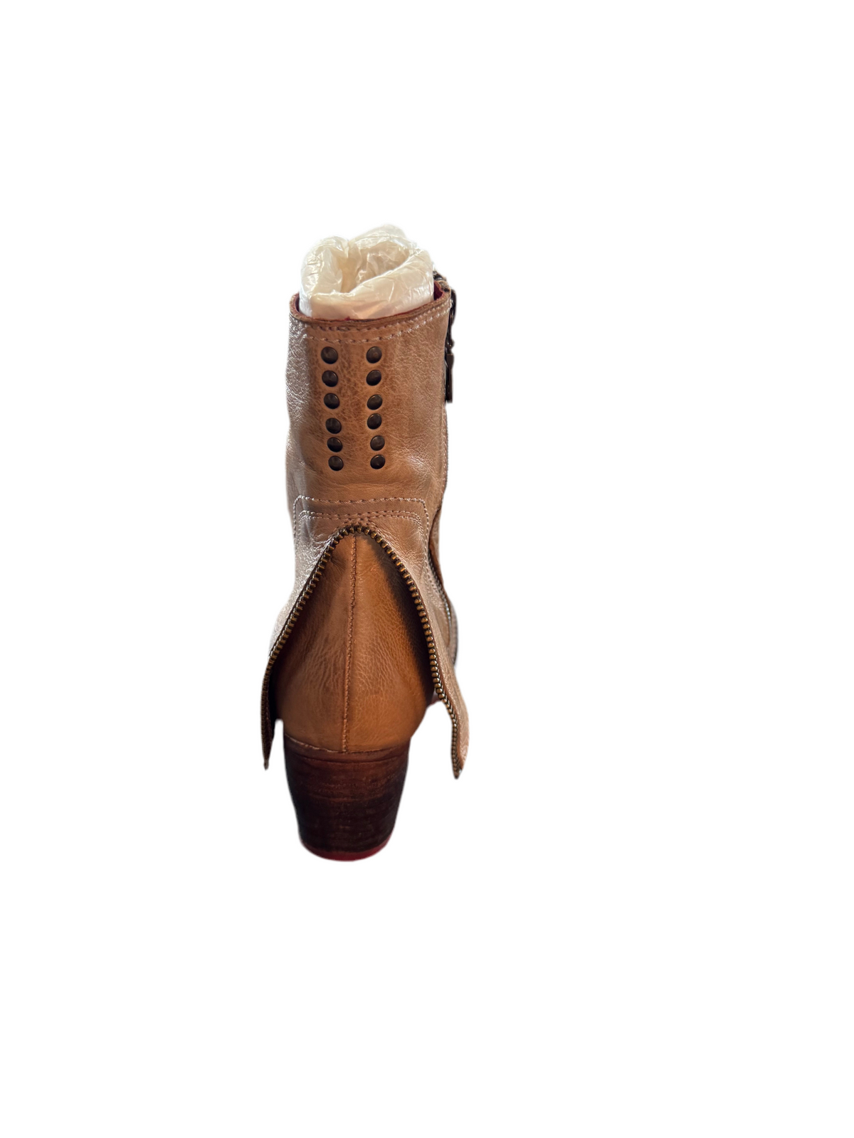 Back by popular demand, IRIS is a unique heeled short boot, made up of layered leather pieces with curved top stitching creating a whimsical effect. IRIS has an inner zipper and a seductive exposed zipper detail up the back. A rounded toe, flat metal studs and a wearable heel height puts IRIS on everyone's must own list.