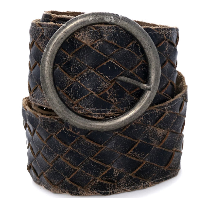 Created from meticulously woven distressed leather and adorned with a round brass-tone buckle, the Dreamweaver effortlessly infuses a touch of vintage allure into your style. Whether worn on the waist or the hip, this belt stands as a remarkable addition to any wardrobe.