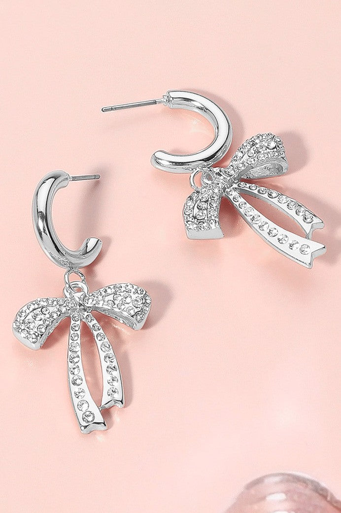 Stone Paved Metal Bow Dangle Mini Hoop Earrings