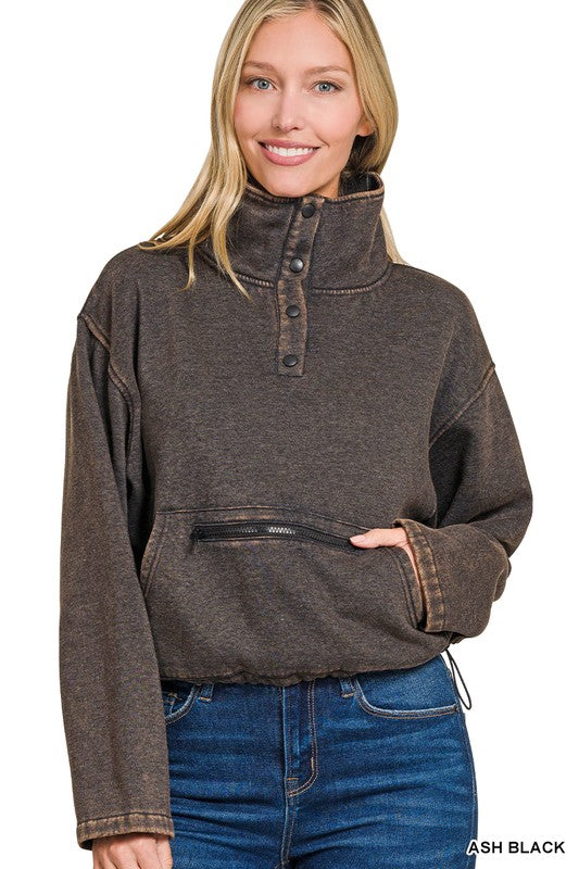 ACID WASH FLEECE HALF SNAP PULLOVER W K POCKET