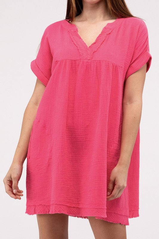 Gauze Rolled Short Sleeve Raw Edge V-Neck Dress