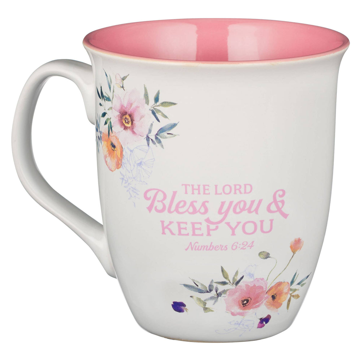 White background with spring floral wreath, Pink screen-printed text, Best Mom Ever, Scripture verse on the back in pink letters, The Lord bless you and keep you, Numbers 6:24, Bless You and Keep You Mom Collection, Ceramic mug, Pink interior, Not microwave and dishwasher safe due to delicate foil, Handwash recommended, Packaged in a tuck-top Kraft cardboard box, Mug dimensions: 4.4" x 5.2" x 3.9" (112 x 132 x 99mm), Packaging dimensions: 4.5" x 4.9" x 4.1" (114 x 124 x 104mm), Capacity: 14 fl. oz. (414ml)