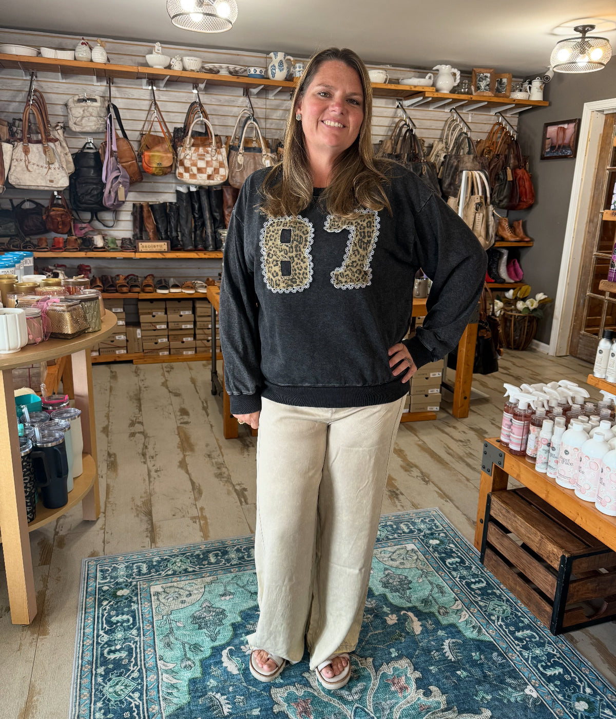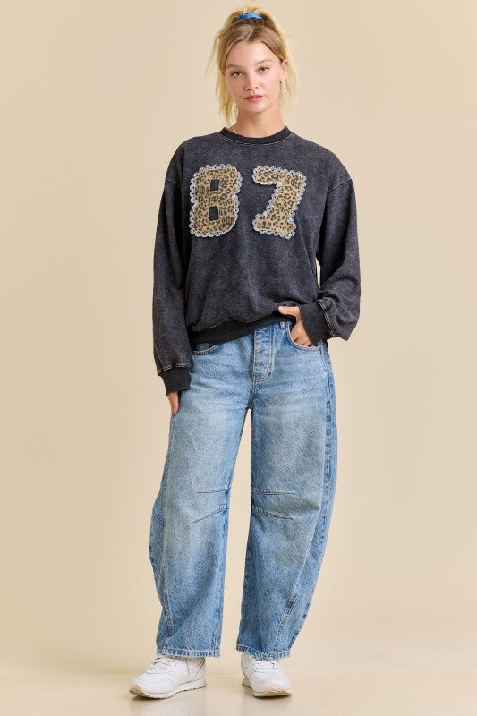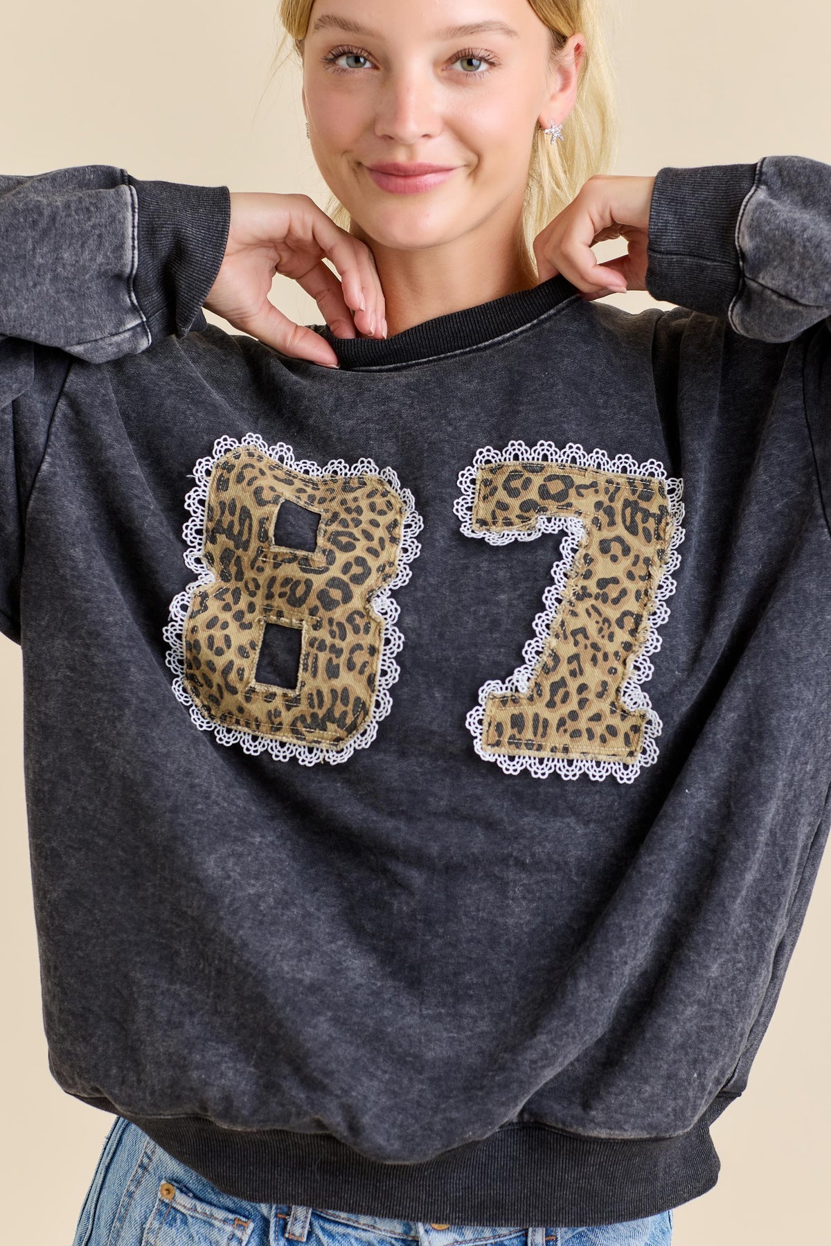"87" Number Patchwork With Leopard Print And Lace Trim Outline Detail