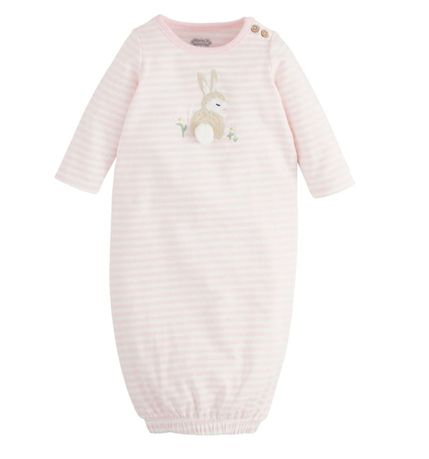 Embroidered cotton spandex sleep gown with coconut wood button shoulder and puff bunny tail.